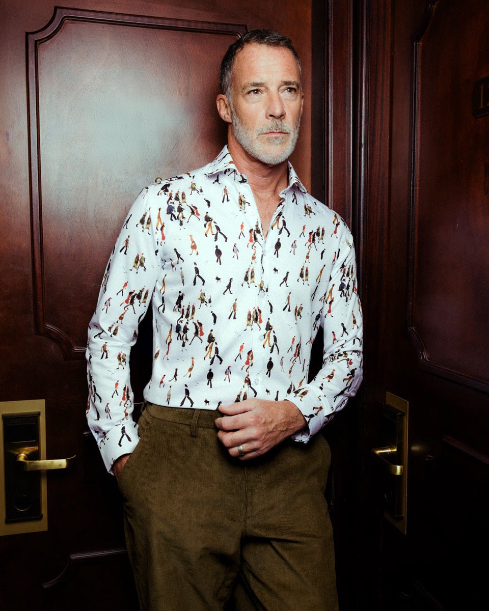 The "Going to Work" shirt lifts those individuals and little crowds straight from the canvas and scatters them across premium cloth, turning the commute into a conversation piece.